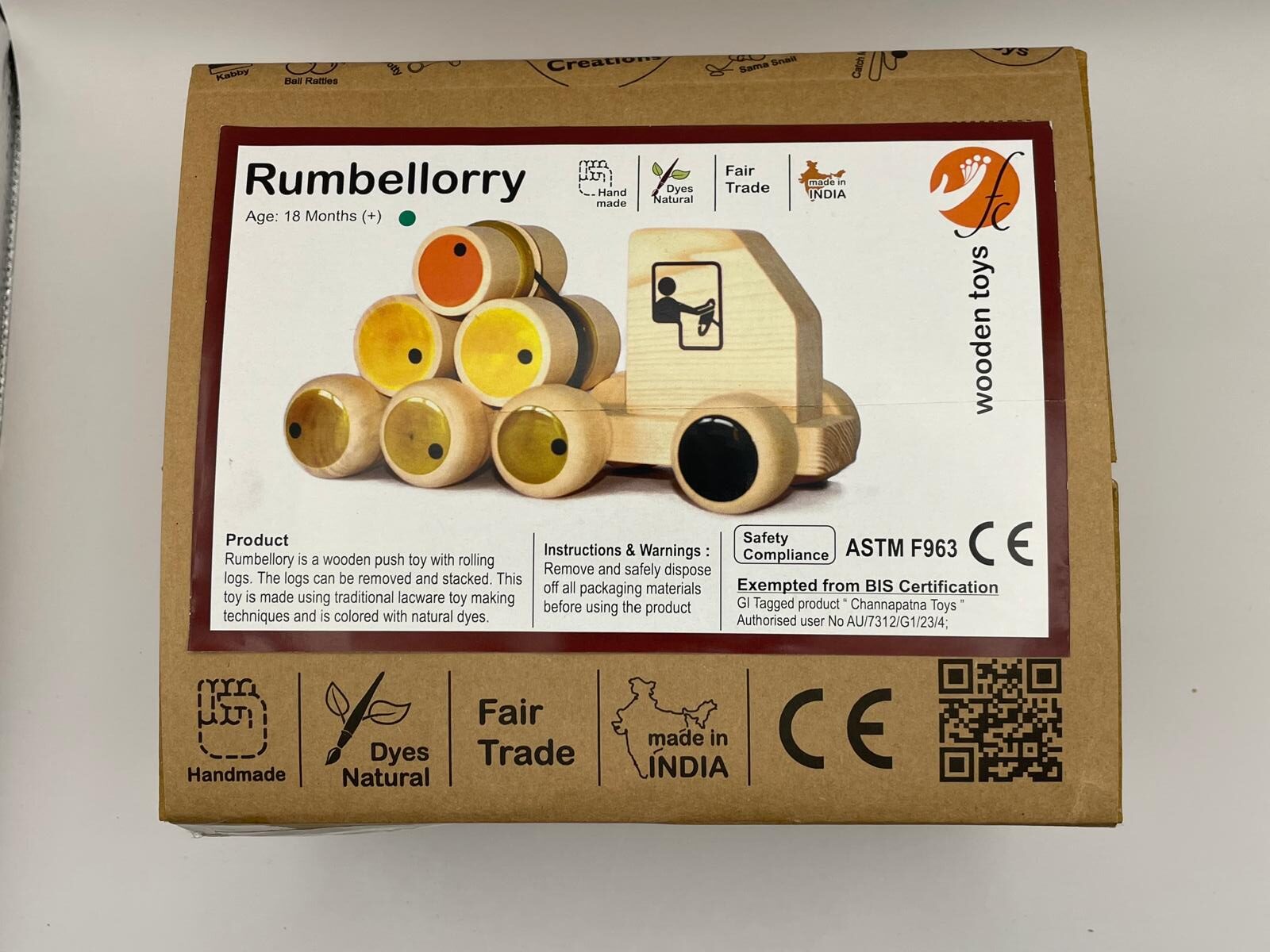 Beschreibung: Viel mehr als nur ein Auto: Der "Rumbellorry" ist ein vielseitiges Schiebespielzeug. Die bunten Holzstämme auf der Ladefläche können abgenommen, gestapelt und wieder aufgeladen werden. Dies fördert spielerisch das Verständnis für Balance und Konstruktion. Gefertigt in der traditionellen Channapatna-Lackkunst-Technik, glänzt dieses Spielzeug durch seine hochwertige Verarbeitung.